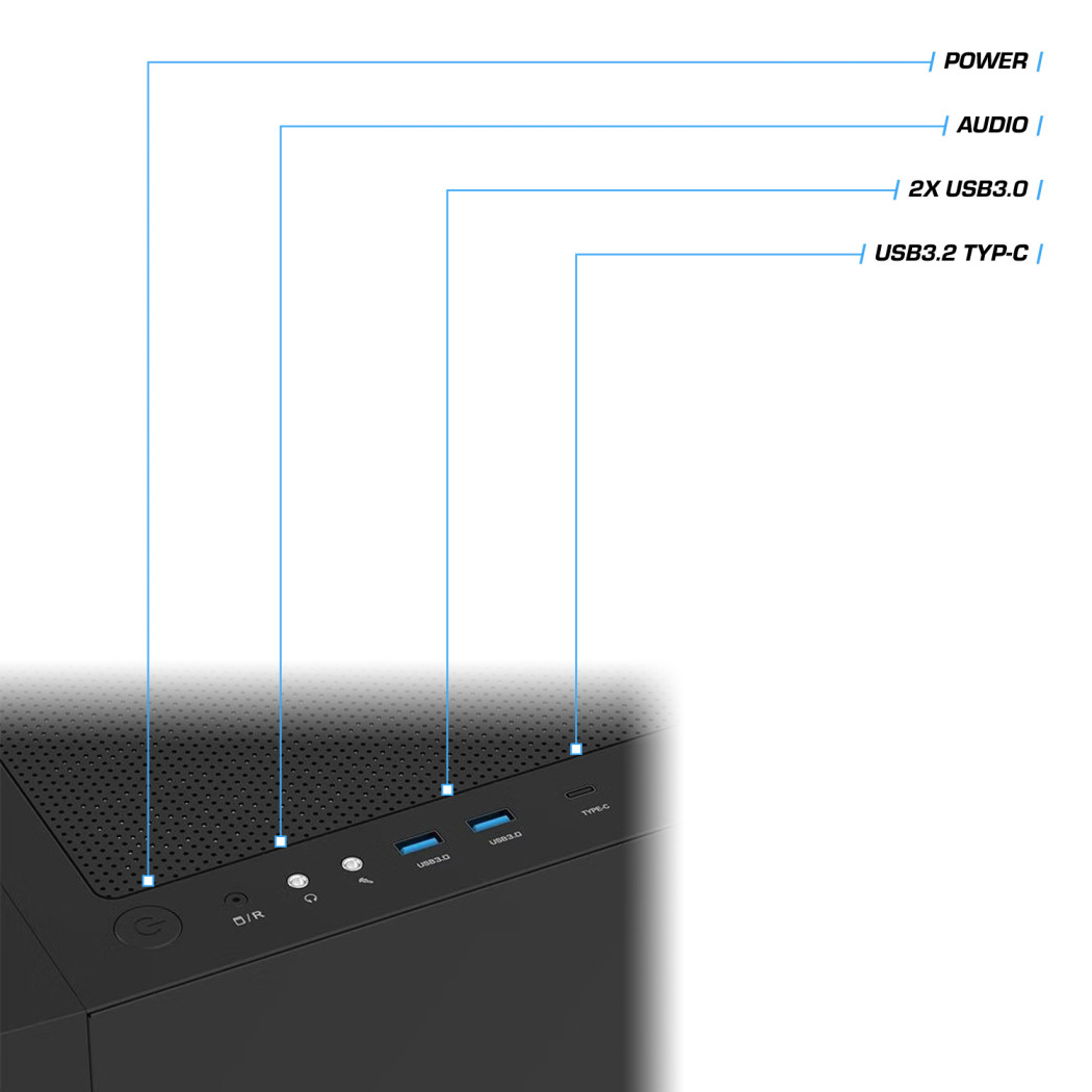 Frontanschlüsse: 1x USB3.2 (Gen 2) Type-C, 2x USB3.0, 1x HD Audio Fensterseitenteil aus 3mm Glas