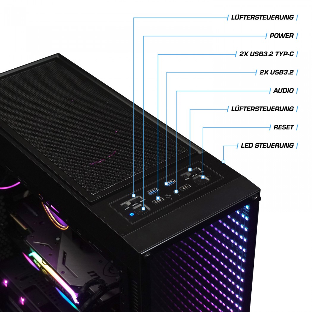 [Alles aus einer Hand] Mit diesem PC-Bundle bleiben keine Wünsche offen - ein rundum gut ausgestattetes Komplett-Paket mit beleuchtetem PC (Farbe einstellbar), 24 Zoll (60cm) TFT-Monitor, Gaming Maus + Tastatur und Wireless LAN. Sofort startklar: nur noch anschließen und sofort loslegen.