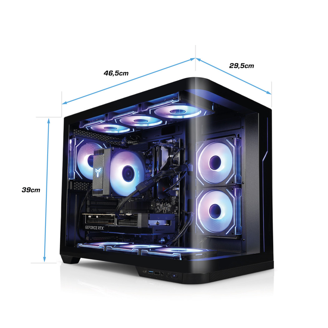 Eine perfekte Ausstattung. In diesem Gamer-PC befinden sich eine schnelle SSD Systemplatte, viel DDR5 Arbeitsspeicher, starker AMD Ryzen Multicore Prozessor, Gaming Grafikkarte, alle gängigen Anschlüsse wie USB3 / HDMI und dies ist einem beeindruckenden Gehäuse mit einstellbarer Beleuchtung.