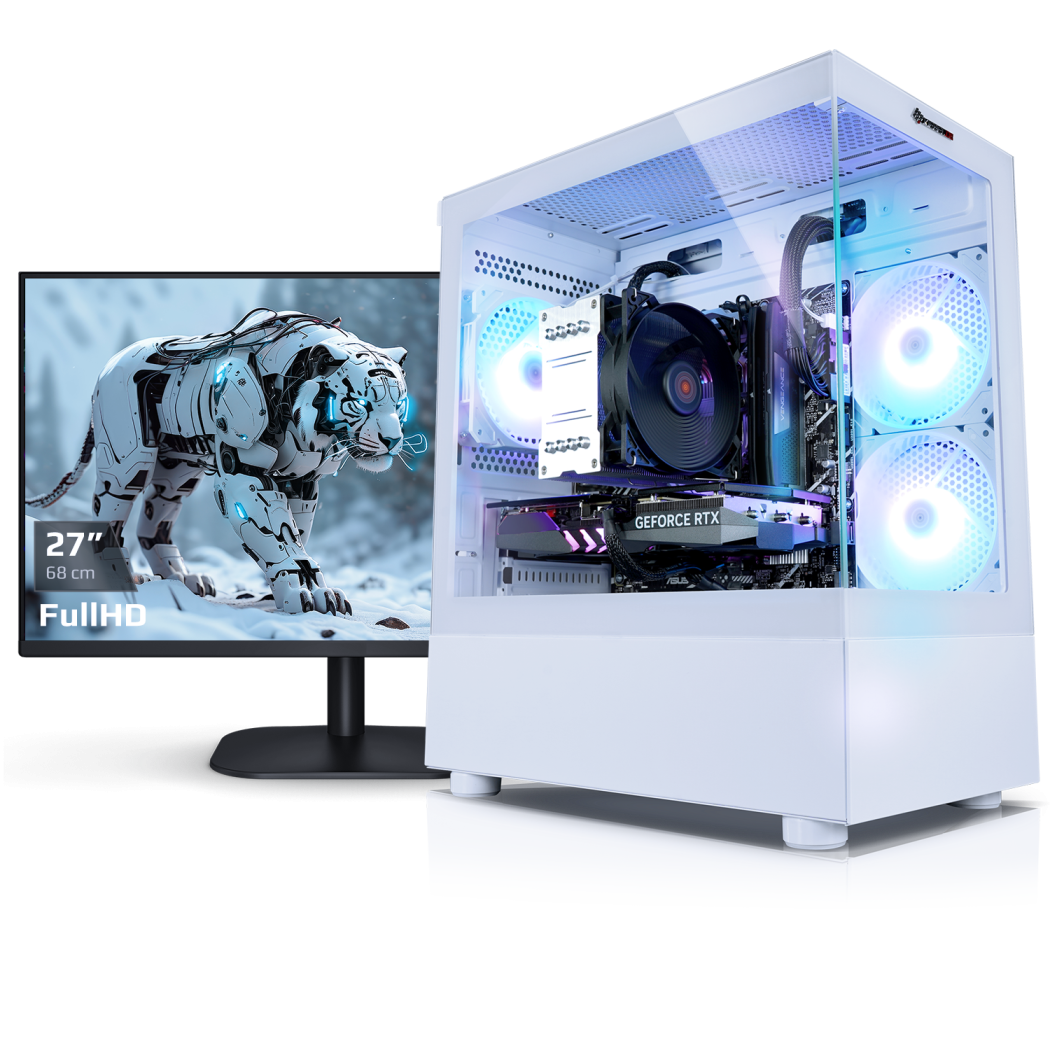 [Alles aus einer Hand] Mit diesem PC-Bundle bleiben keine Wünsche offen - ein rundum gut ausgestattetes Paket mit beleuchtetem PC (Farbe einstellbar), 27 Zoll (68,5cm) TFT-Monitor und Wireless LAN. Sofort startklar - nur noch anschließen und loslegen.