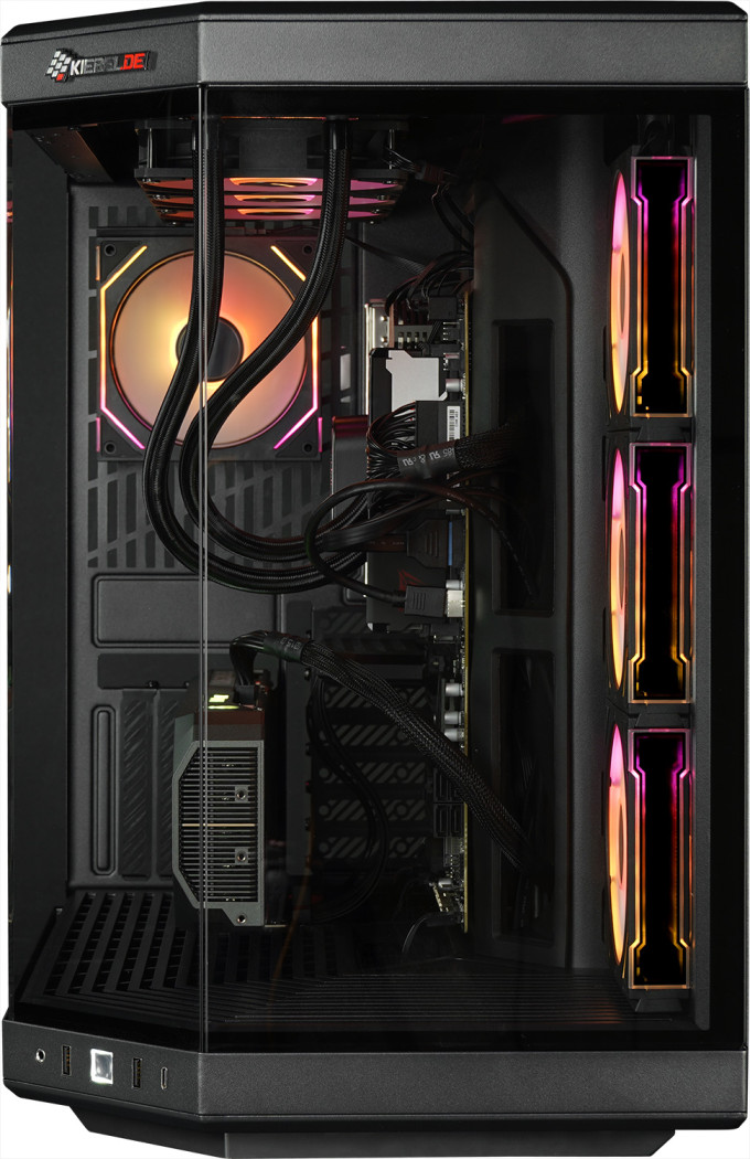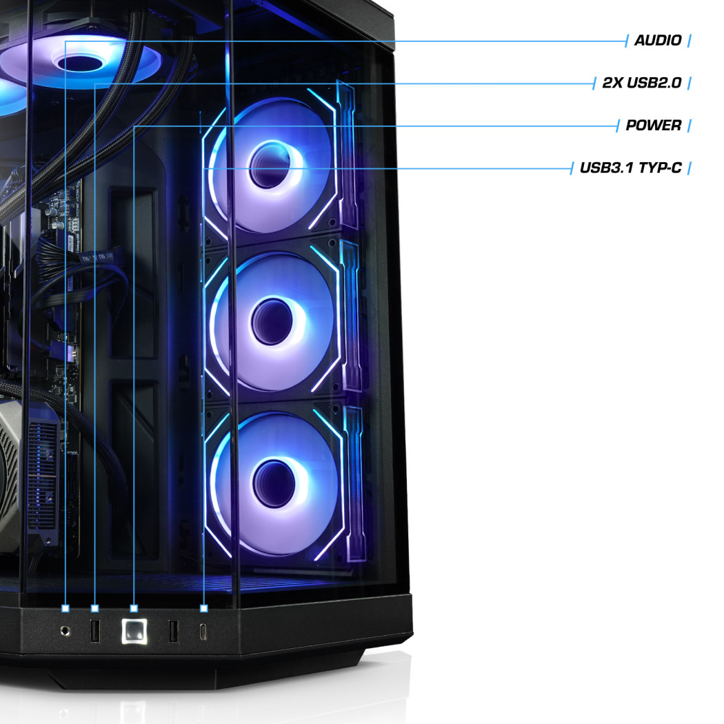 Der Panorama Gamer-PC ist nicht nur ein optischer Blickfang - dank der 240mm großen Wasserkühlung und weiteren 6 eingebauten ARGB-Lüfter wird eine perfekte Kühlung realisiert. Das optische Highlight strahlt durch hochwertige Glasscheiben in atemberaubenden Farbeinstellungen.